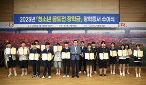 나주교육진흥재단, ‘청소년 꿈도전 장학금’ 지급관내 16개 중·고교 학생 81명에게 7천973만4천원 지원 나주교육진흥재단(이사장 윤병태)은 지난 9일 ‘2025년 청소년 꿈도전 장학금’에 선발된 나주시 중·고등학생 81명(중학생 41, 고등학생 40)에게 1인당 최대 100만 원씩 장학금 총7천 973만4천원을 지급했다고 10일 밝혔다. ‘청소년 꿈도전 장학금’은 학생들이 스스로 진로를 설계하고 그 꿈에 도전하는 것을 지원하는 장학금으로 성적 위주의 기존 장학금 제도를 개편해 2024년부터 지급하고 있다. 장학생 선발은 관내 중·