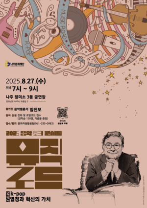 나주문화재단, ‘뮤직로드 Step 2’ 음악 토크 콘서트 개최대중음악 평론가 임진모, ‘K-POP 열정과 혁신’ 주제 강연 나주문화재단이 시민들의 문화 향유 기회를 넓히기 위한 특별 기획 프로그램 ‘뮤직로드(Music Road)’ 두 번째 무대를 준비했다.재단은 오는 8월 27일(수) 오후 7시, 나주정미소에서 열리는 ‘뮤직로드 Step 2’ 무대에 국내 대표 대중음악 평론가 임진모를 초청해 *‘K-POP의 열정과 혁신’*을 주제로 한 음악 토크 콘서트를 개최한다고 19일 밝혔다.음악과 이야기가 함께하는 토크 콘서트‘뮤직로드’는 단