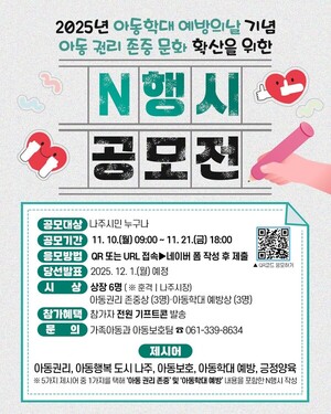 나주시, 제4회 아동 권리 존중 ‘N행시 공모전’ 개최세계 아동학대 예방의 날 기념…시민 참여로 아동 권리 문화 확산 전라남도 나주시가 세계 아동학대 예방의 날을 맞아 시민이 함께 만드는 아동권리 존중 문화를 확산한다.나주시(시장 윤병태)는 오는 11월 19일 ‘제19회 세계 아동학대 예방의 날’을 기념해 제4회 아동 권리 존중 문화 확산을 위한 ‘N행시 공모전’을 개최한다고 3일 밝혔다. 이번 공모전은 ㈜우둥과 전남중부권아동보호전문기관의 후원으로 4년 연속 진행하는 공모전이며 아동학대 예방과 아동 권리 존중의 중요성을 시민 스스로