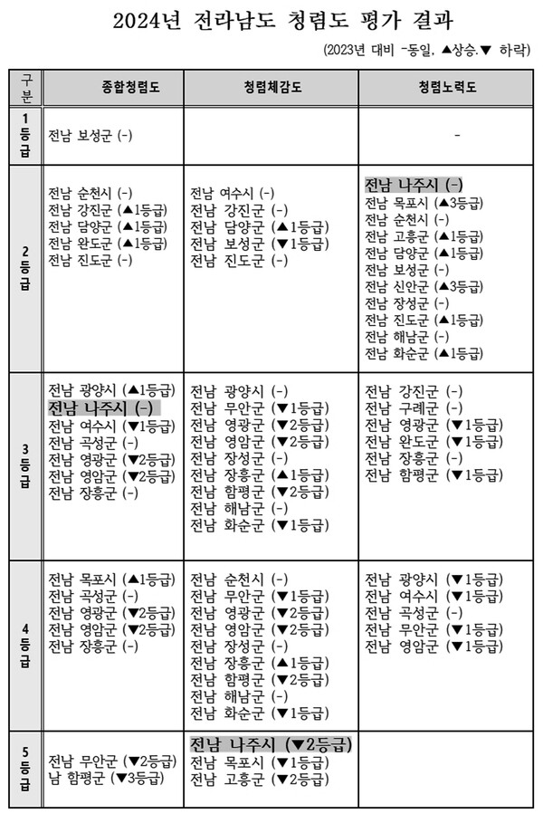 종합청렴도 3등급 민선 8기 나주시 청렴도 상승 노력에