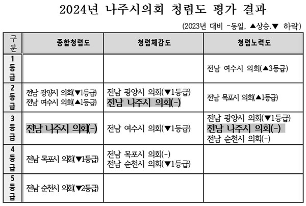 한편, 나주시의회도 나주시와 종합청렴도 3등급 평가를 받았다. 청렴 체감도는 2등급이며, 청렴 노력 도는 3등급으로 발표 자료 지표에서 작년과 같은 수준으로 발표됐다.