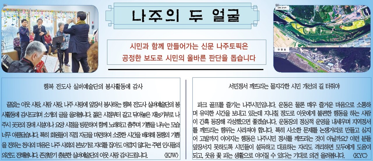나주의 두 얼굴 기자명 나주토픽 다른 공유 찾기 기사스크랩하기 본문 글씨 크기 본문 글씨 줄이기 가 본문 글씨 키우기 바로가기 나주의 두 얼굴 입력 2025.01.24 01:40 수정 2025.01.26 02:06 댓글 0 나주토픽 다른 기사 보기 저작권자 © 나주토픽 무단전재 및 재배포 금지 다른 공유 찾기 이 기사를 공유합니다 페이스북(으)로 기사보내기 트위터(으)로 기사보내기 URL복사(으)로 기사보내기 닫기 라이브리 댓글 작성을 위해 JavaScript를 활성화 해주세요