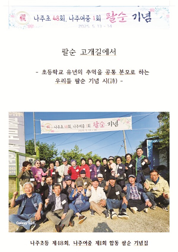 팔순을 맞은 나주초등학교 48회와 나주여중 1회 동창들이 함께 부른 환영시의 첫 구절은 그 자체로 잔치의 의미를 담고 있었다. 오랜 세월을 헤쳐 왔어도, 이름 석 자만 들어도 다정한 정이 되살아나는 우정, 그것이 바로 동창의 힘이다.