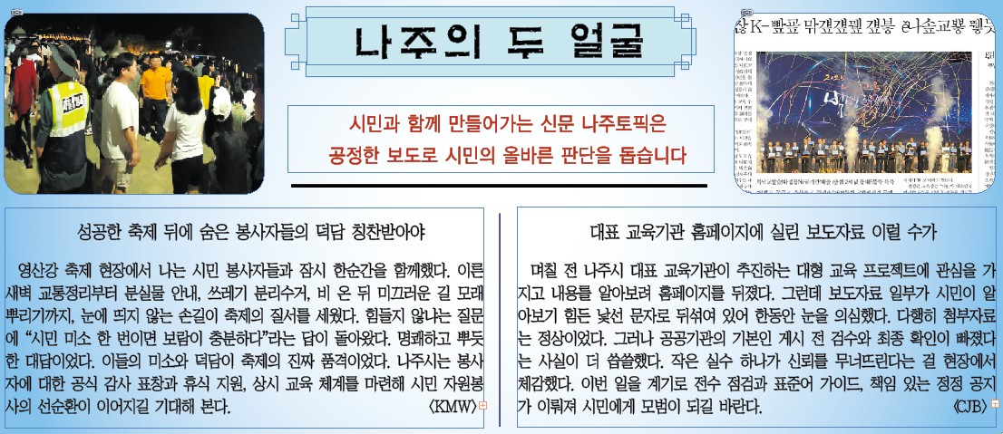 나주의 두 얼굴 기자명 나주토픽 다른 공유 찾기 기사스크랩하기 본문 글씨 크기 본문 글씨 줄이기 가 본문 글씨 키우기 바로가기 나주의 두 얼굴 입력 2025.10.23 17:15 수정 2025.10.23 23:51 댓글 0 나주토픽 다른 기사 보기 저작권자 © 나주토픽 무단전재 및 재배포 금지 다른 공유 찾기 이 기사를 공유합니다 페이스북(으)로 기사보내기 트위터(으)로 기사보내기 URL복사(으)로 기사보내기 닫기 라이브리 댓글 작성을 위해 JavaScript를 활성화 해주세요