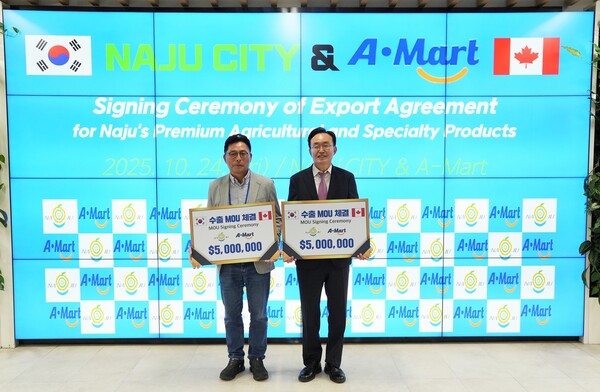전라남도 나주시가 캐나다 현지 대형 유통업체와 손잡고 지역 농수산식품의 글로벌 수출 확대에 나섰다. 나주시(시장 윤병태)는 지난 24일 전라남도 농업기술원에서 캐나다 A-Mart(대표 최병화)와 500만 달러 규모의 농수산식품 수출 업무협약(MOU)을 체결했다고 27일 밝혔다.